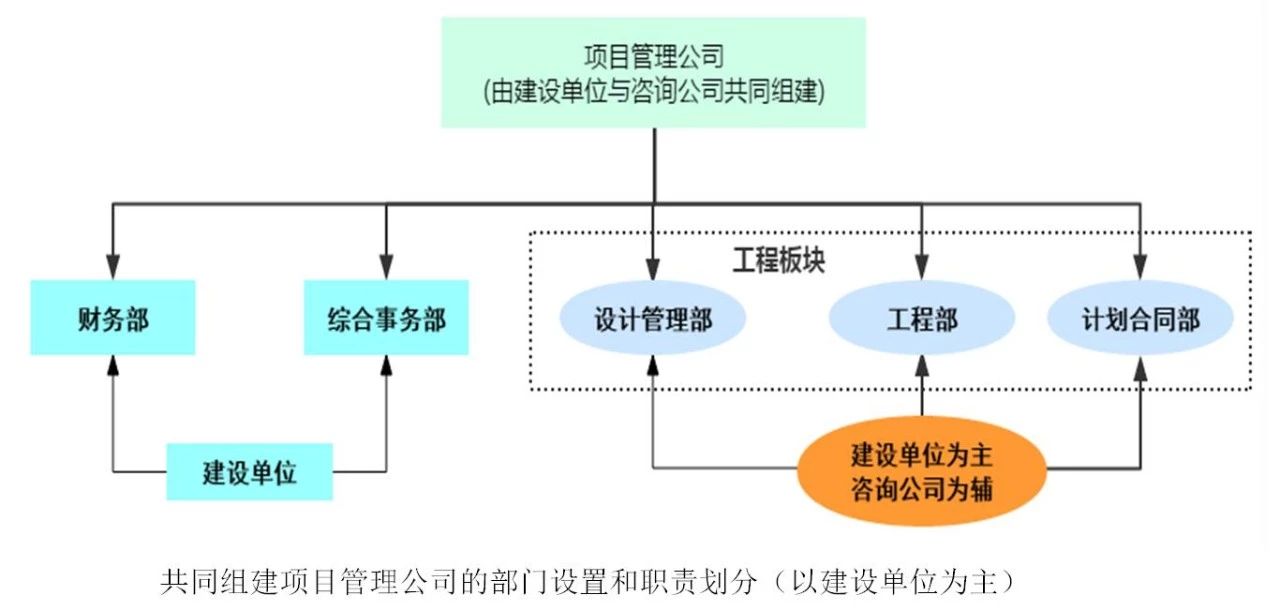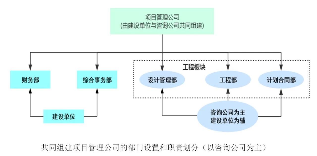 在這種模式下,以咨詢公司為主,建設(shè)單位為輔一起組建項目公司(或項目部),大部分的專業(yè)技術(shù)人員由咨詢公司提供并組建各職能部門,建設(shè)單位僅安排少數(shù)人員在關(guān)鍵崗位任職。
