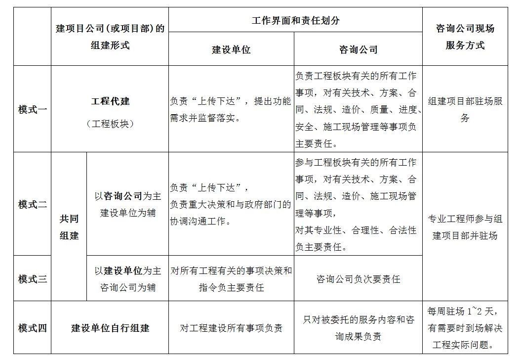 這種模式由建設(shè)單位自行組建項目公司(或項目部)和各職能部門,咨詢公司不參與組建項目部(人員不常駐現(xiàn)場),僅對項目建設(shè)提供前期策劃、制度建設(shè)、招投標(biāo)、法律法規(guī)、工程管理、合同管理、造價管理等與工程建設(shè)有關(guān)的技術(shù)支持。