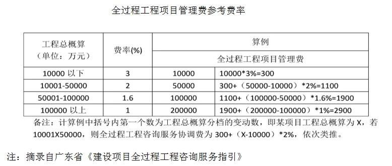 “1”是指全過程工程咨詢費,參考費率如表。表中所列收費標(biāo)準(zhǔn)是基于完全由咨詢公司組建工程板塊各職能部門的收費水平,具體根據(jù)咨詢公司的參與程度和工作模式分別進行不同程度的折扣。