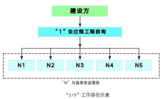 對應(yīng)“1+N”的收費模式,全過程工程咨詢的工作開展模式也可以借用“1+N”的概念。“1”是指全過程工程咨詢角色,主要起到牽頭、統(tǒng)籌、協(xié)調(diào)、管理、上傳下達等職能要求,對項目上的若干個“N”進行統(tǒng)籌管理;“N”是指項目全過程各專業(yè)咨詢(投資咨詢、勘察、設(shè)計、監(jiān)理、造價咨詢、設(shè)計咨詢、招標(biāo)代理、法律顧問、試驗檢測、運營維護等),這些“N”所代表的專業(yè)工作可以納入全過程咨詢范疇,也可以另行委托。