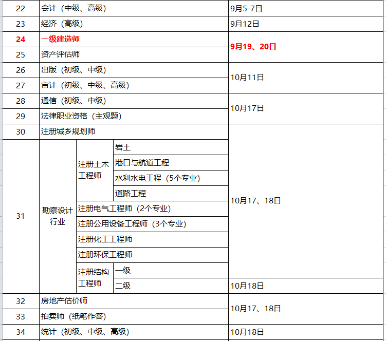 24 | 一級(jí)建造師 | 9月19、20日 | ||