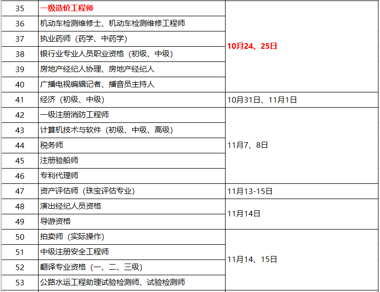 35 | 一級(jí)造價(jià)工程師 | 10月24、25日 | ||