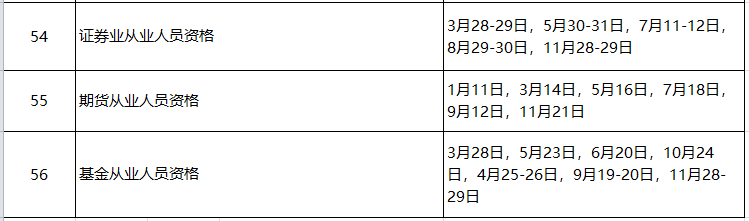 56 | 基金從業(yè)人員資格 | 3月28日,5月23日,6月20日,10月24日,4月25-26日,9月19-20日,11月28-29日 |